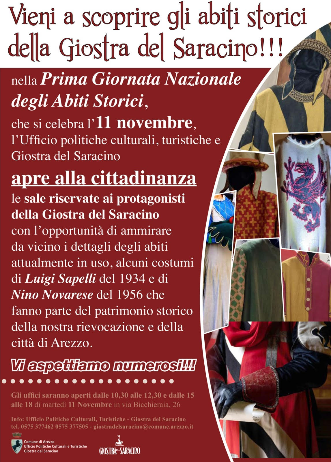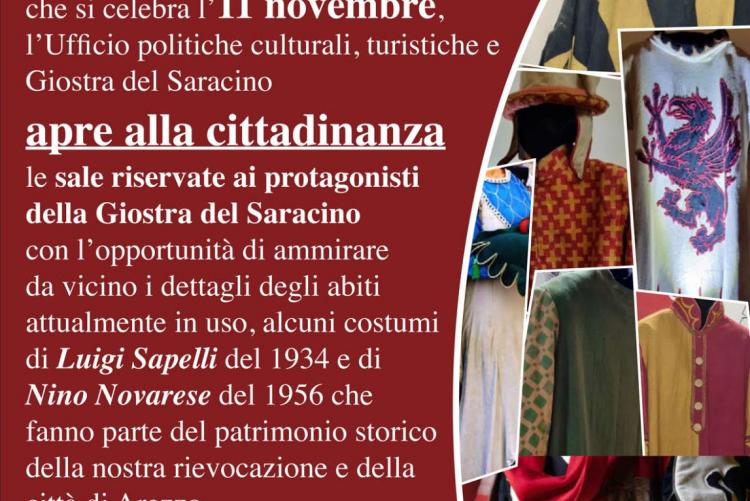Con la legge n. 59 del 15 aprile 2025, volta alla promozione delle manifestazioni in abiti storici, è stata istituita la Giornata nazionale degli abiti storici e il 6 novembre, a Roma, presso il Museo della Civiltà, alla presenza del ministro del Turismo Daniela Santanché e del ministro dell'Istruzione e del Merito Giuseppe Valditara, si è svolta la conferenza stampa di presentazione della ricorrenza istituita annualmente nella data dell'11 novembre. Un importante passo verso la valorizzazione del patrimonio culturale e turistico italiano del quale anche l'eredità rappresentata dagli abiti storici è una forte espressione. La legge 59 ha l’obiettivo fondamentale di promuovere, sostenere e valorizzare stabilmente le manifestazioni in abiti storici su tutto il territorio nazionale con un duplice scopo: riconoscere questi eventi come patrimonio identitario della storia e della cultura italiana e usarli come potente strumento di sviluppo turistico ed economico. "D’ora in poi – ha detto il ministro Santanchè nel corso della conferenza stampa – l’11 novembre è un invito a esplorare le radici della nostra identità culturale e a scoprire la bellezza che si cela nei dettagli degli abiti storici, nei cui tessuti si legge un pezzo della trama della nostra storia. Gli abiti storici sono la testimonianza di chi siamo e di quali sono le nostre radici". Anche la Giostra del Saracino vuole celebrare la Prima Giornata Nazionale degli Abiti Storici e ha scelto di farlo aprendo alla cittadinanza, martedì 11 novembre, le porte dell'Ufficio politiche culturali, turistiche e Giostra del Saracino di via Bicchieraia 26, svelando così le sale riservate ai protagonisti della Giostra con l'opportunità di ammirare da vicino i dettagli degli abiti attualmente in uso e alcuni costumi di Luigi Sapelli del 1934 e di Nino Novarese del 1956 che fanno parte del patrimonio storico della nostra rievocazione storica e della città di Arezzo.