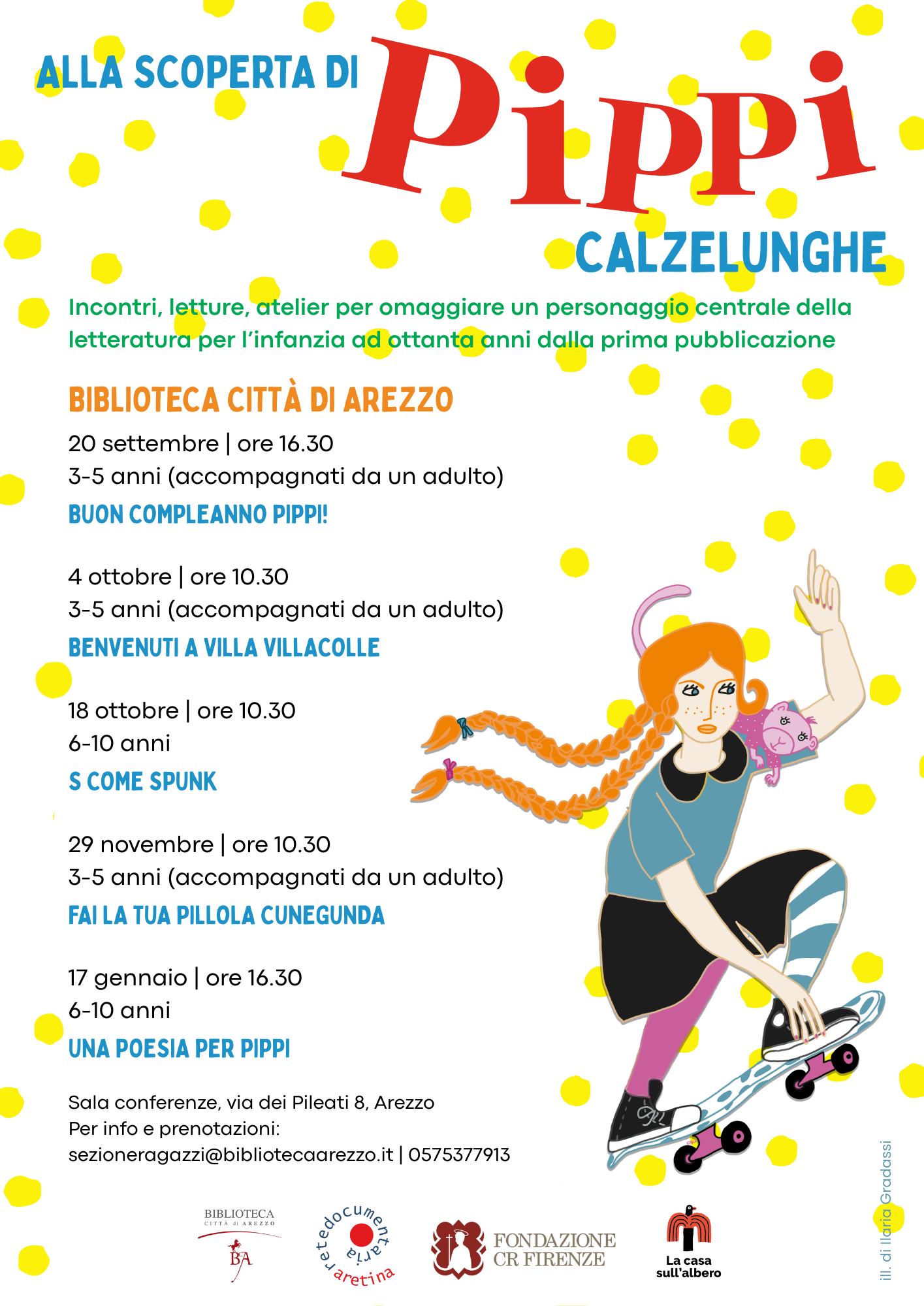 Il progetto è promosso dalla Rete Documentaria Aretina che, per sua stessa natura, è il soggetto che facilita la relazione e lo scambio tra le biblioteche della provincia aretina che, in questa occasione, si incontrano sul territorio comune della letteratura rivolta ai più giovani, utilizzando come cornice quella di uno dei classici più amati da generazioni di bambini. Un progetto articolato che vede la collaborazione con la libreria La Casa sull’albero ed è stato finanziato dalla Cassa di Risparmio di Firenze con l’obiettivo di riaccendere i riflettori sulla figura di Pippi Calzelunghe stimolando la rilettura e l’approfondimento del romanzo più conosciuto di Astrid Lindgren.