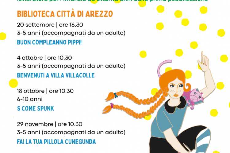 Sabato 20 settembre alle ore 16.30 nella Sala Conferenze della Biblioteca Città di Arezzo si terrà il primo dei 21 incontri dedicati a Pippi Calzelunghe che si svolgeranno in 9 biblioteche della Rete Documentaria Aretina da settembre 2025 fino a febbraio 2026. “Buon compleanno Pippi!” è il titolo del primo appuntamento della rassegna rivolto a bambini dai 3 ai 5 anni (accompagnati da un adulto) che apre un ricco programma di incontri, letture, atelier per omaggiare un personaggio centrale della letteratura per l’infanzia ad ottanta anni dalla prima pubblicazione.
