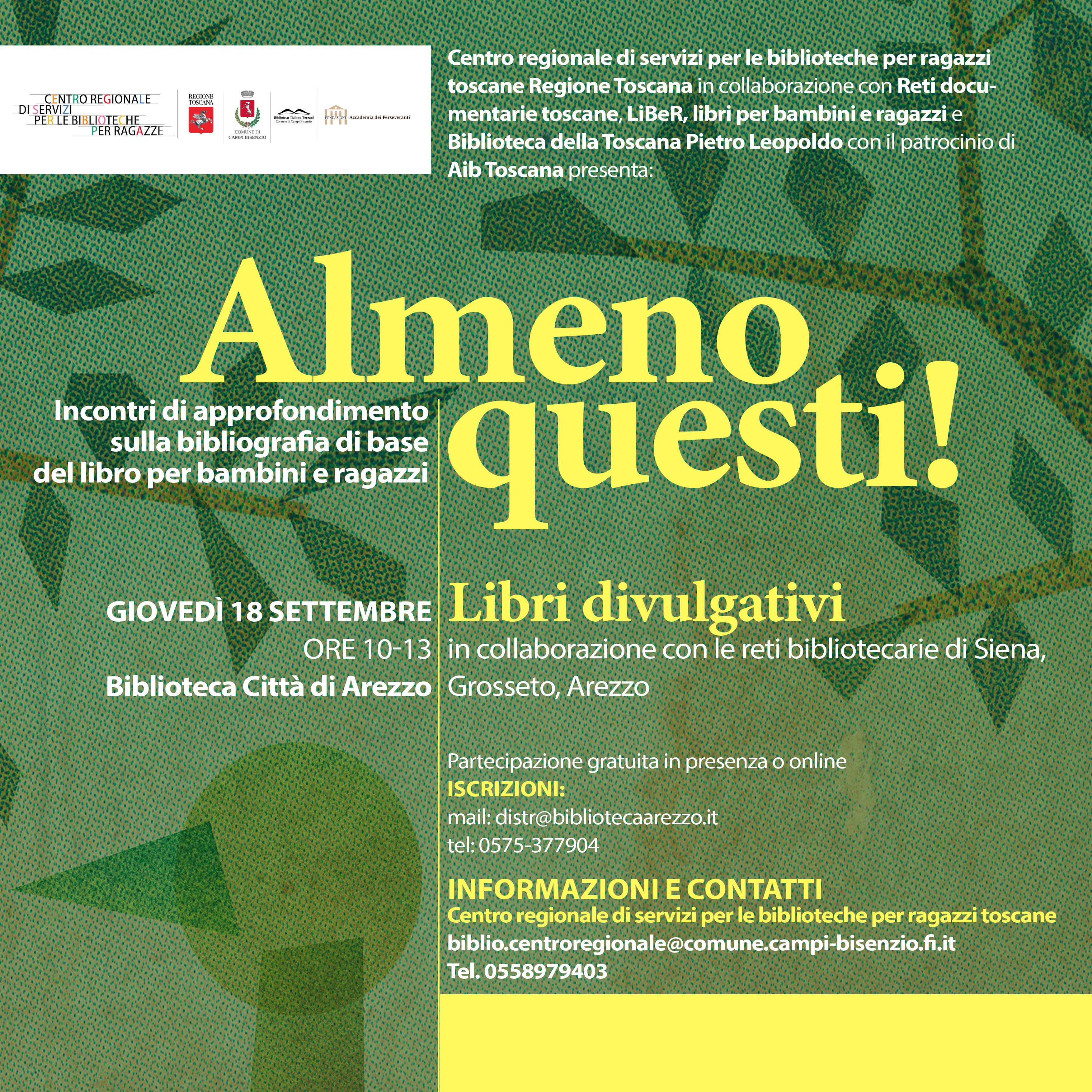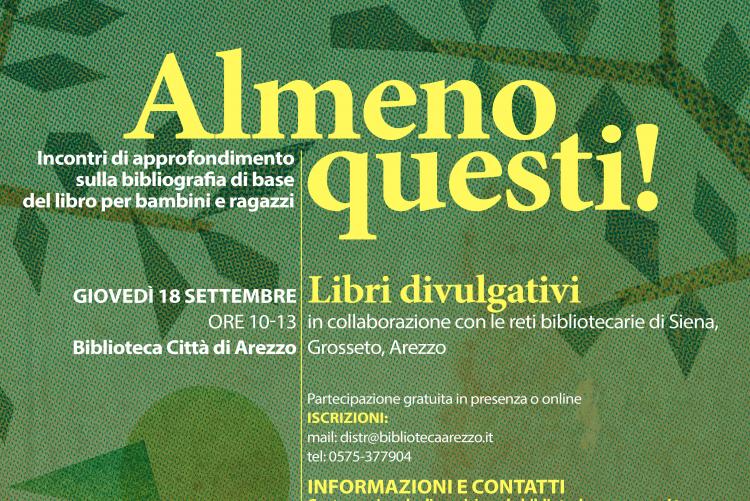 Giovedì 18 settembre, dalle ore 10,00 alle 13,00, si svolgerà presso la Sala Conferenze della Biblioteca Città di Arezzo uno degli incontri di formazione e approfondimento della diciassettesima edizione dell'iniziativa "Almeno questi!", dedicata alla bibliografia di base del libro per bambini e ragazzi. Nello specifico il tema dell'incontro sarà "Libri divulgativi".