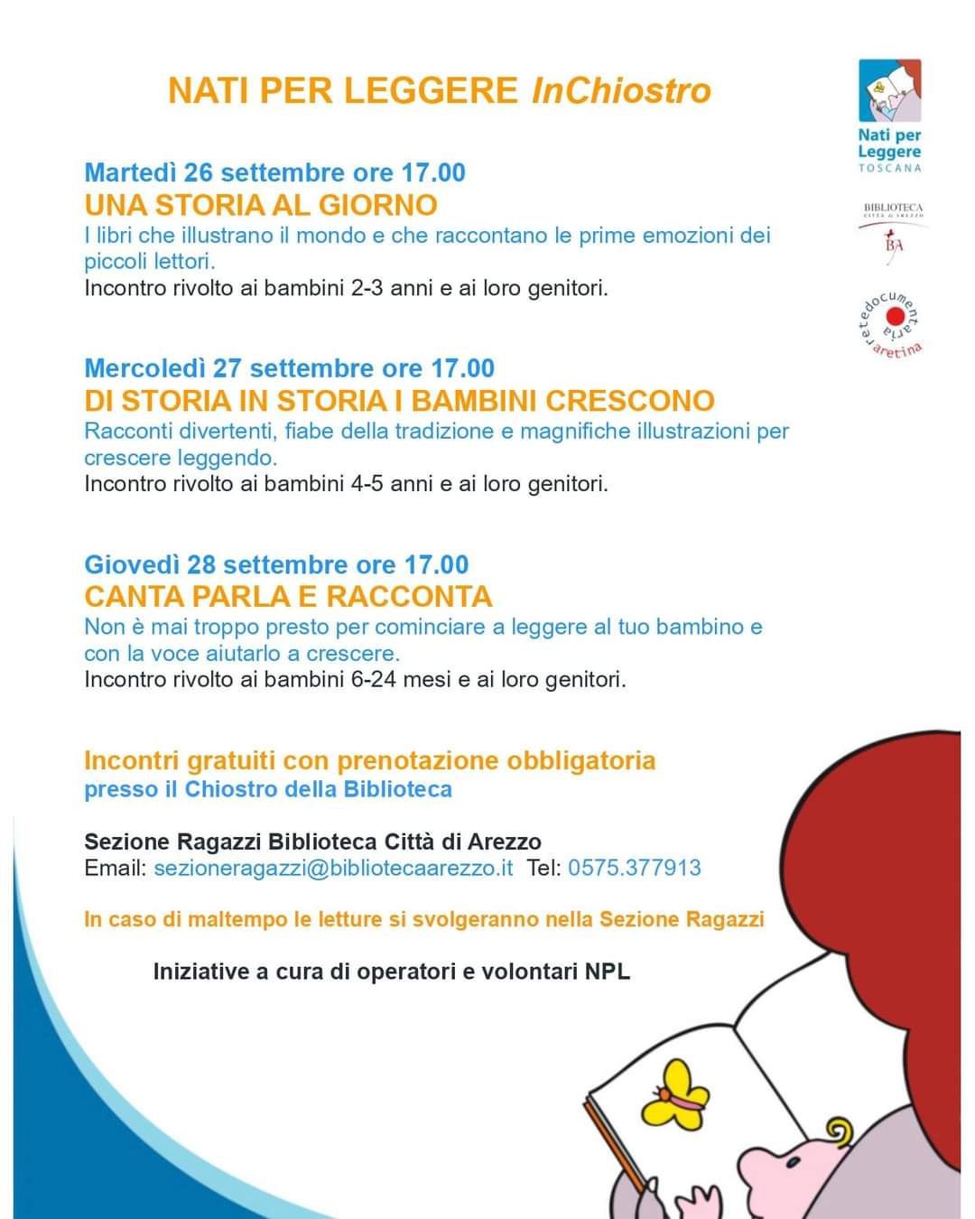 Proseguono anche nel mese di SETTEMBRE, nella Sezione Ragazzi della Biblioteca Città di Arezzo, gli appuntamenti di Nati per Leggere dedicati ai bambini da 0-5 anni.