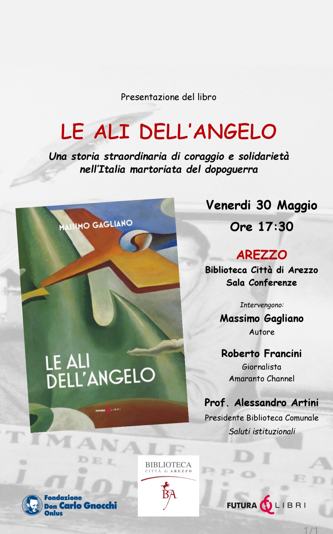 E' l'impresa de l'Angelo dei Bimbi, unica e avvincente in tutti i suoi risvolti, raccontata dallo scrittore Massimo Gagliano nel libro "Le Ali dell'Angelo" edito da Futura Libri e presentato presso la Sala Conferenze della Biblioteca "Città di Arezzo" venerdì 30 maggio alle ore 17.30. Interloquiranno con l'autore il giornalista Roberto Francini di Amaranto Channel e il presidente della Biblioteca prof. Alessandro Artini.