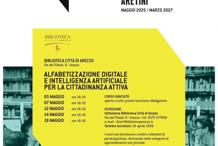 Il 5 maggio 2026, dalle ore 16.00 alle ore 19.00, inizia presso la Biblioteca Città di Arezzo il corso "Alfabetizzazione digitale e intelligenza artificiale per la cittadinanza attiva" che è volto a promuovere l'uso consapevole e creativo delle tecnologie multimediali e dell'Intelligenza Artificiale.