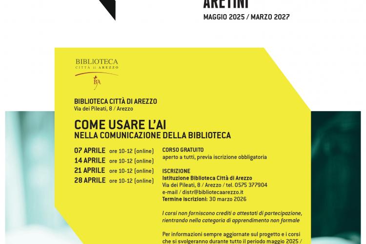 Il 7 aprile 2026dalle ore 10.00 alle ore 12.00, inizia il corso "Come usare l'AI nella comunicazione della Biblioteca", volto a insegnare strategie di scrittura sul web e come utilizzare l'AI generativa per velocizzare e semplificare le fasi di stesura dei testi.
