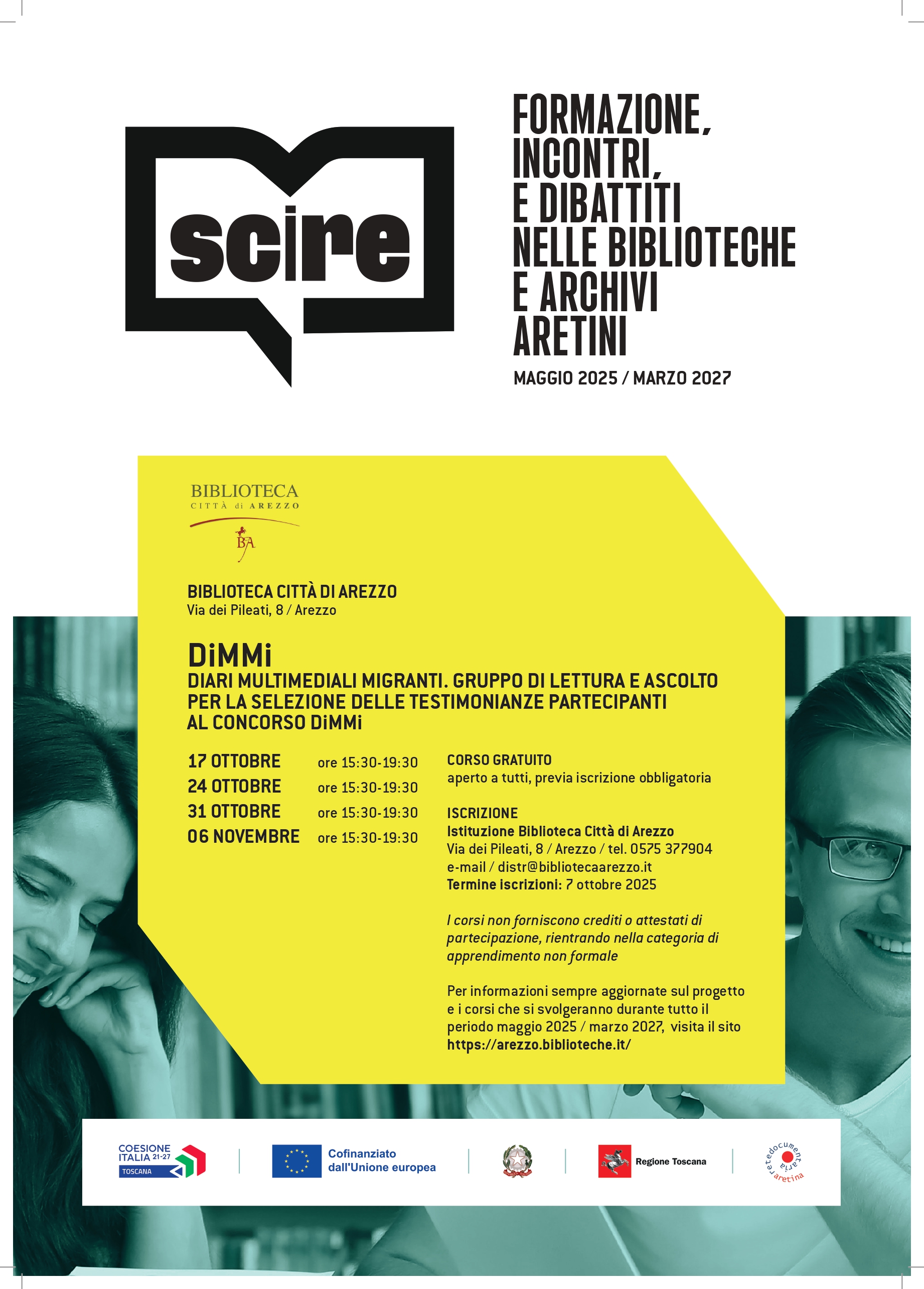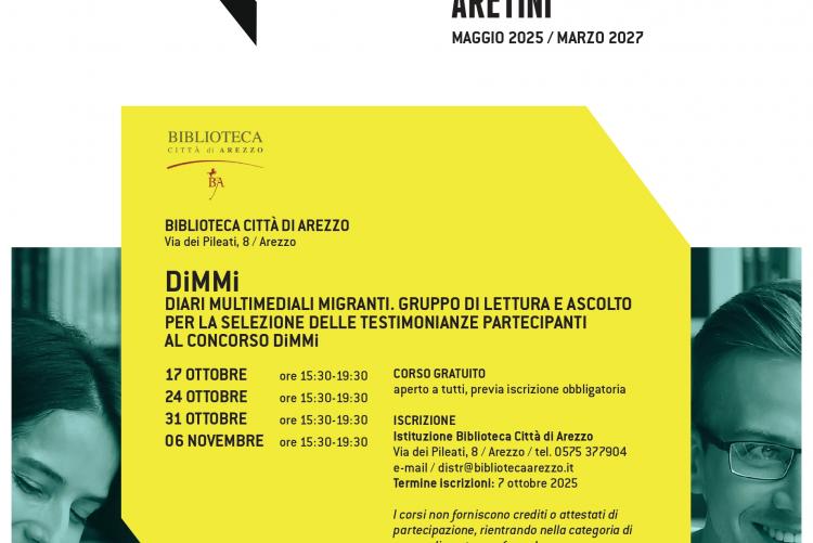 Il 17 ottobre 2025dalle ore 15.30 alle ore 19.30, inizia presso la Biblioteca Città di Arezzo il corso "DiMMi: Diari Multimediali Migranti. Gruppo di lettura e ascolto per la selezione delle testimonianze partecipanti al concorso DiMMi", volto principalmente alla promozione del dialogo interculturale e dell'inclusione sociale attraverso la valorizzazione delle testimonianze raccolte con il progetto DiMMi - Diari Multimediali Migranti. Questo percorso formativo mira a coinvolgere un pubblico ampio e diversificato, includendo adulti, giovani, migranti e chiunque sia interessato a partecipare attivamente ai gruppi di lettura/ascolto.