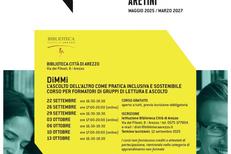 Il 22 settembre 2025dalle ore 16.30 alle ore 19.30, inizia presso la Biblioteca Città di Arezzo il corso "DiMMi: l'ascolto dell'altro come pratica inclusiva e sostenibile. Corso per formatori di gruppi di lettura e ascolto", volto principalmente a preparare i partecipanti a creare, gestire e facilitare gruppi di lettura e ascolto in contesti interculturali per contribuire alla promozione dell'inclusione sociale e del dialogo.