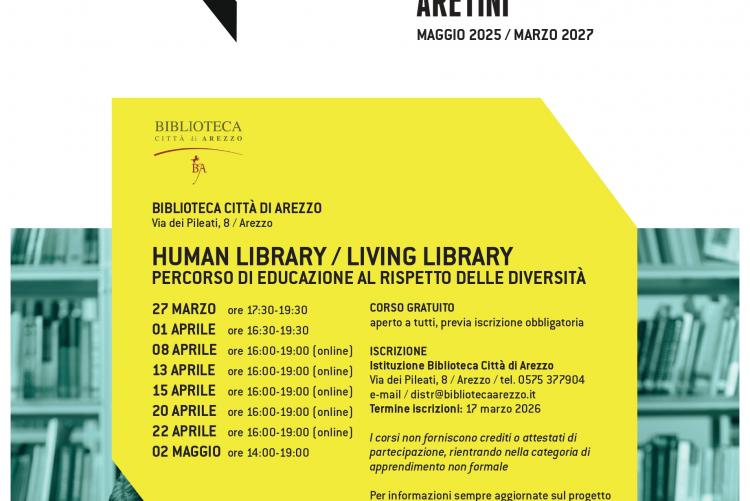 Il 27 marzo 2026, dalle ore 17.30 alle ore 19.30, inizia presso la Biblioteca Città di Arezzo il corso "Human library / living library: percorso di educazione al rispetto delle diversità" che, attraverso i racconti di persone consapevoli di appartenere a minoranze e che si offrono come libri viventi, è volto ad affrontare e approfondire l'argomento degli stereotipi, dei pregiudizi e delle discriminazioni di ogni genere.
