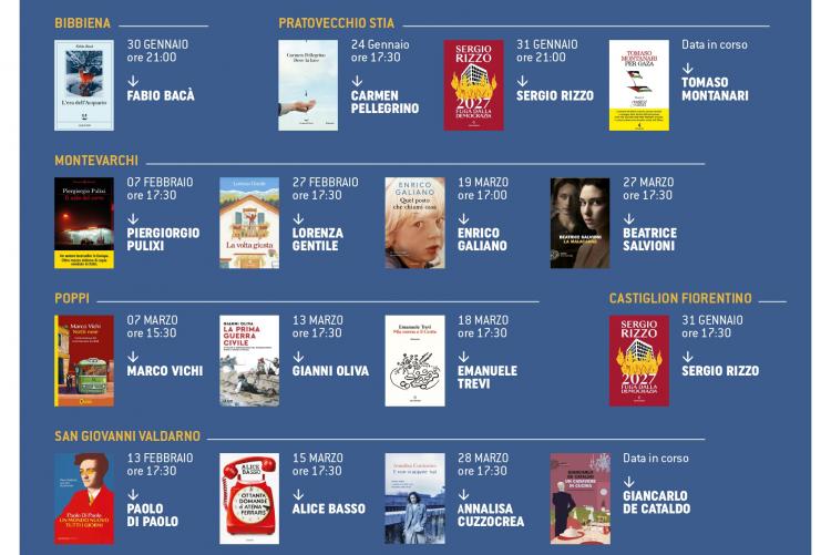 L’incontro di apertura si svolgerà alla Biblioteca Città di Arezzo con Gian Marco Griffi, autore di “Ferrovie del Messico” Premio Libro dell'anno di Fahrenheit, venerdì 16 gennaio e la chiusura sarà affidata ad Annalisa Cuzzocrea, giornalista de La Repubblica, il 28 marzo.